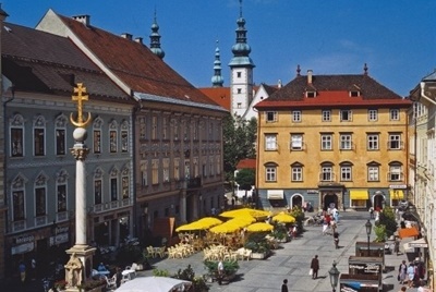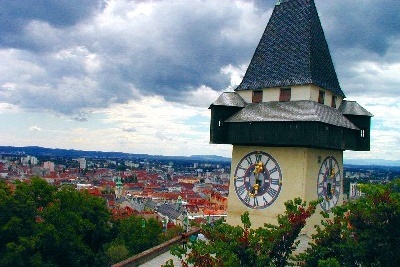 The capital of Styria is located on the Southern outskirts of the Alps, a very pleasant landscape of smaller hills.The clock tower is the true symbol of Graz. The clock face has an unusual story; for a long time the 5.4 m long hand was the only one which indicated the hour. The smaller hand (2.7m) which shows the minutes were added later, which explains the unusual reversal in size. In the clock tower hangs one of the oldest bells in the province (1382). This former court church was built between 1438 and 1464 on the orders of Emperor Friedrich III. Only in the year 1786 did this large and light church become the Cathedral of Graz. On the south western corner of the exterior, you can find the "Landplagenbild" form the year 1485. This faded fresco is a reminder of the 1480 Plagues (Turks, Plague and locusts), which brought Graz into a state of fear and horror.